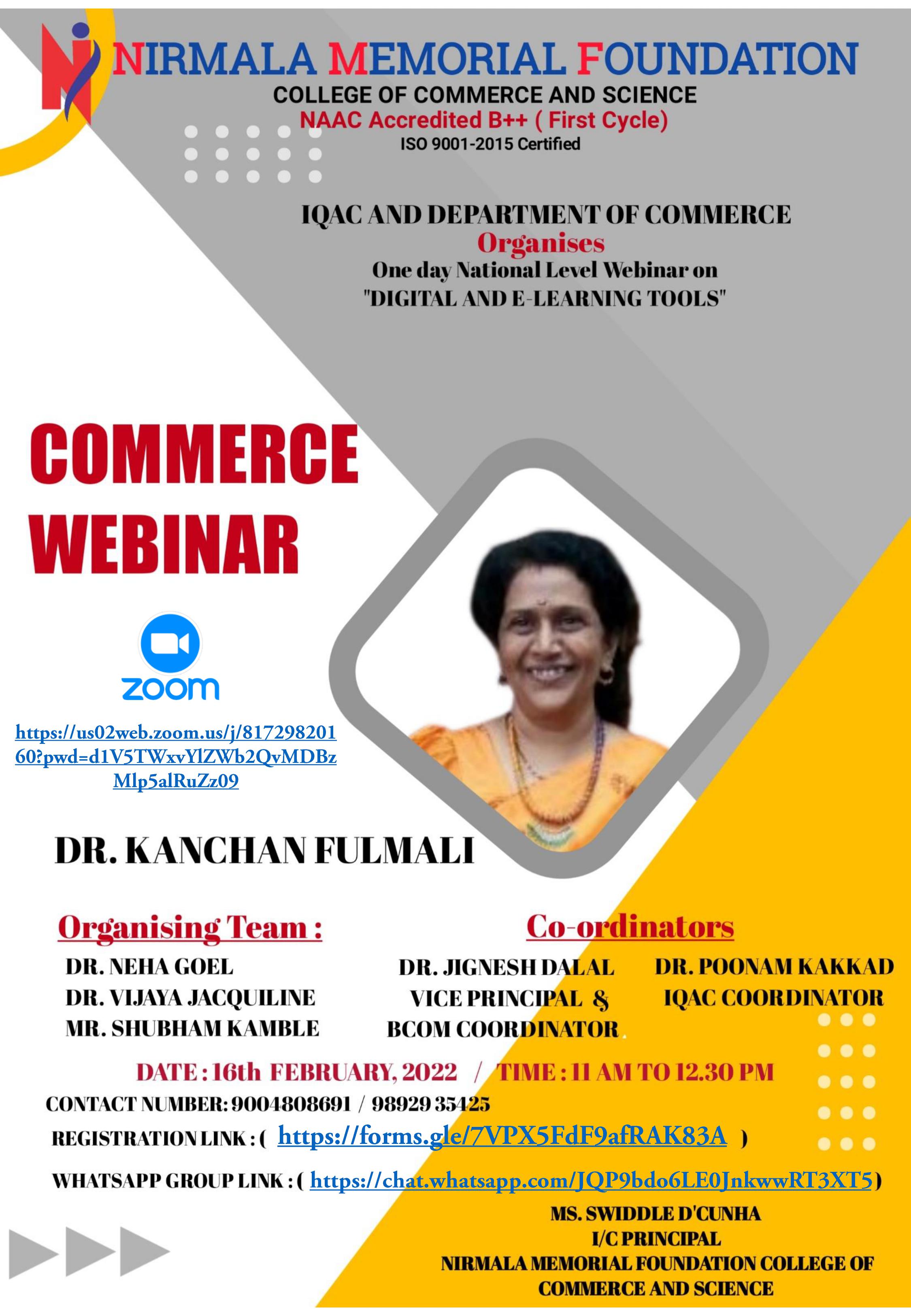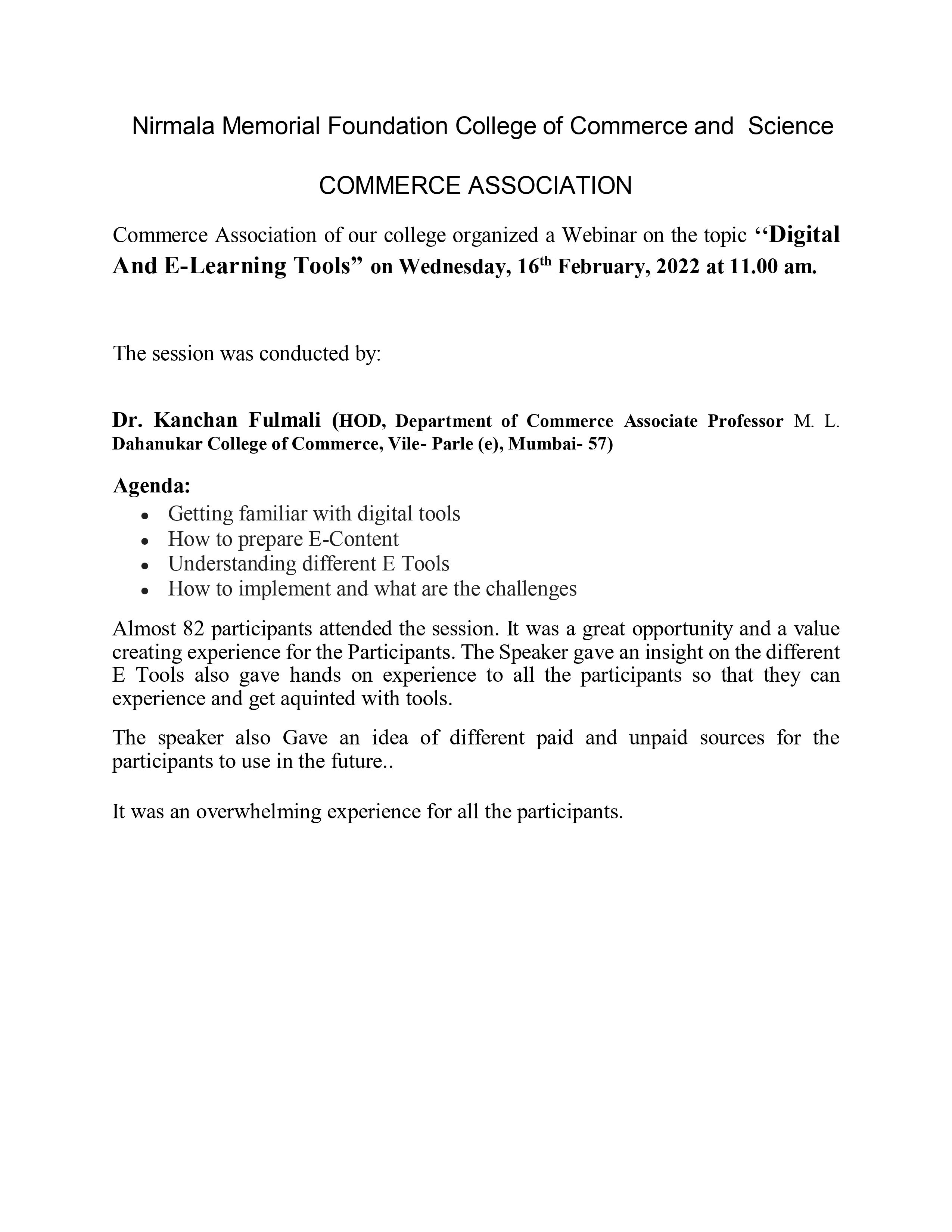 Commerce Association of our college organized a Webinar on the topic ‘‘Digital And E-Learning Tools” on Wednesday, 16th February, 2022 at 11.00 am.