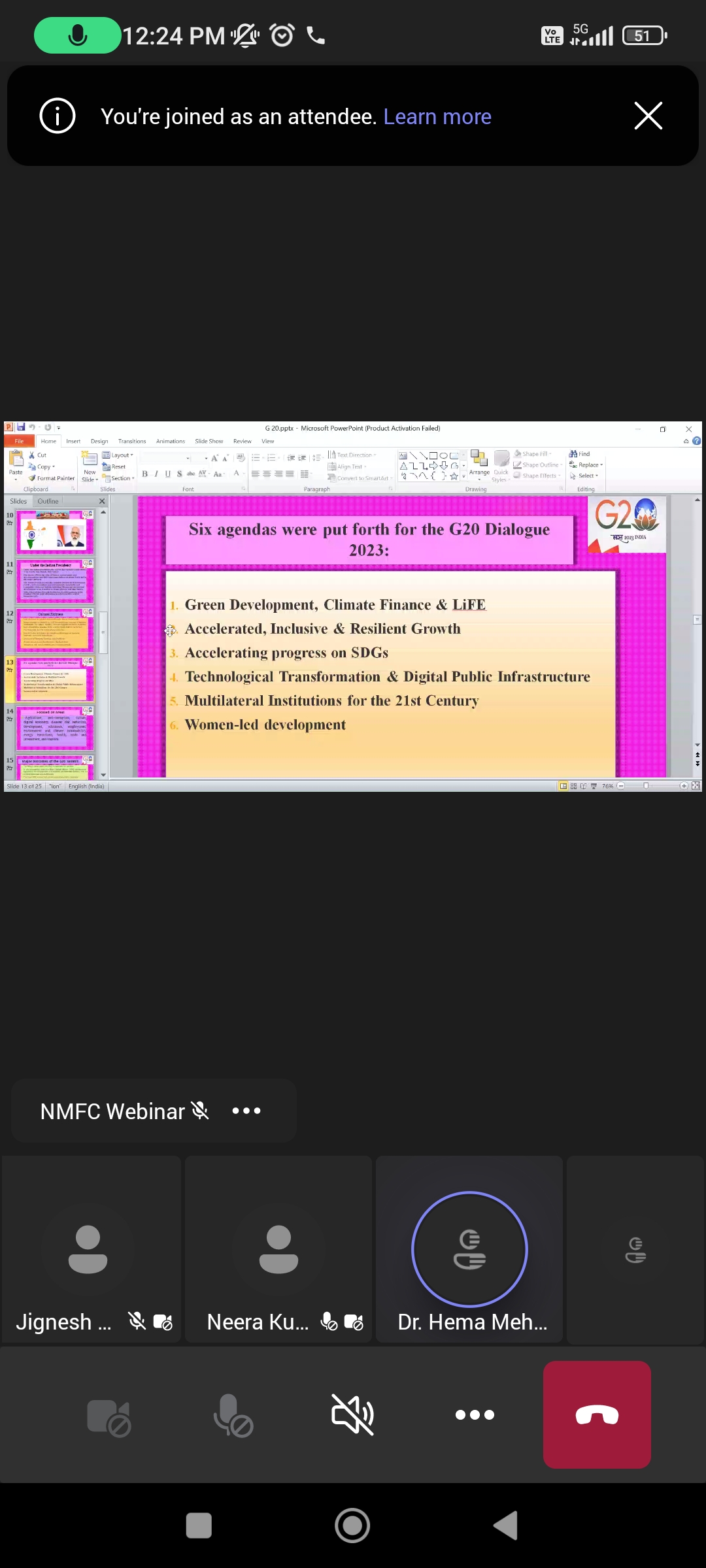 G20's role in global governance and its impact on international economic and political issues. Dr. Hema Mehta, an Associate Professor in Tolani College of Commerce was the resource person. She began the session by explaining the concept of G20, its 6 agendas and the areas it focused on like education, agriculture, employment, health, etc. She elaborated on the major outcomes of G20 in the 2023 summit followed by a detailed discussion on its 5 key takeaways. The webinar gave several significant outcomes. It heightened awareness among participants about the G20's significance in addressing global economic and political challenges. Attendees gained insights into the organisation's key objectives, accomplishments and areas of potential improvement, fostering a more informed and engaged global citizenry. Additionally, the webinar facilitated constructive discussions on how individuals and organisations can contribute to the G20's efforts to promote international co-operation and sustainable development. 60 participants from various states of India like Bihar, Gujarat, Maharashtra, Rajasthan, etc. attended the session and benefited from it.