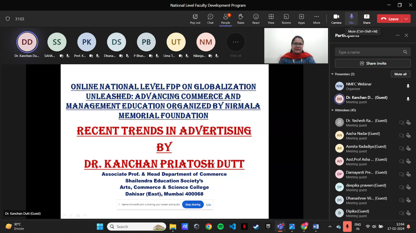 Day 5: Dr. Kanchan Datt, Associate Professor and Head of the Department at Shailendra College, examined Recent Trends in Advertising, providing participants with insights to navigate and leverage the dynamic landscape of contemporary advertising for effective communication and brand impact.