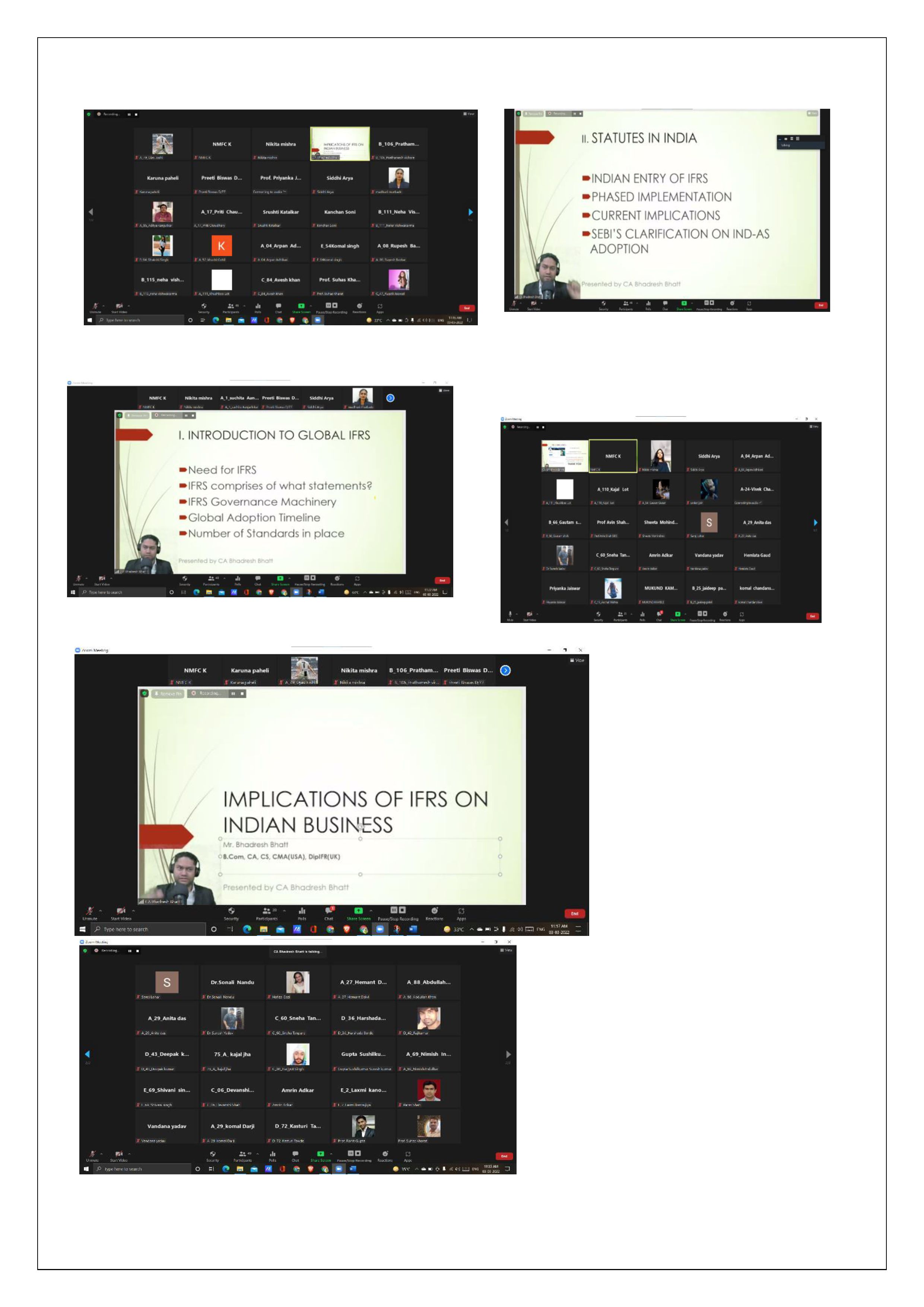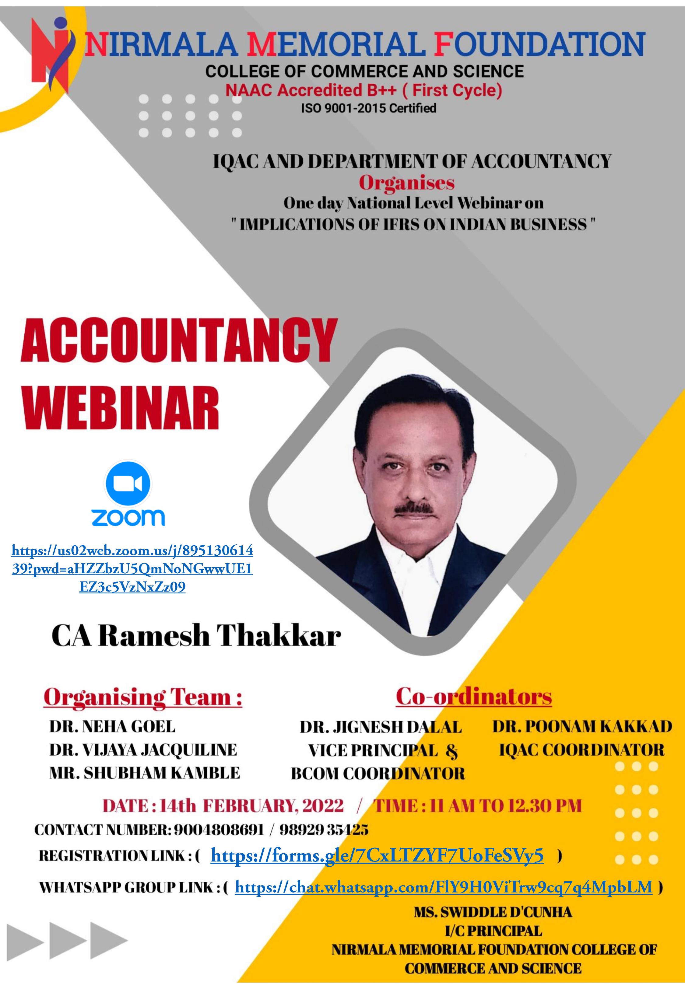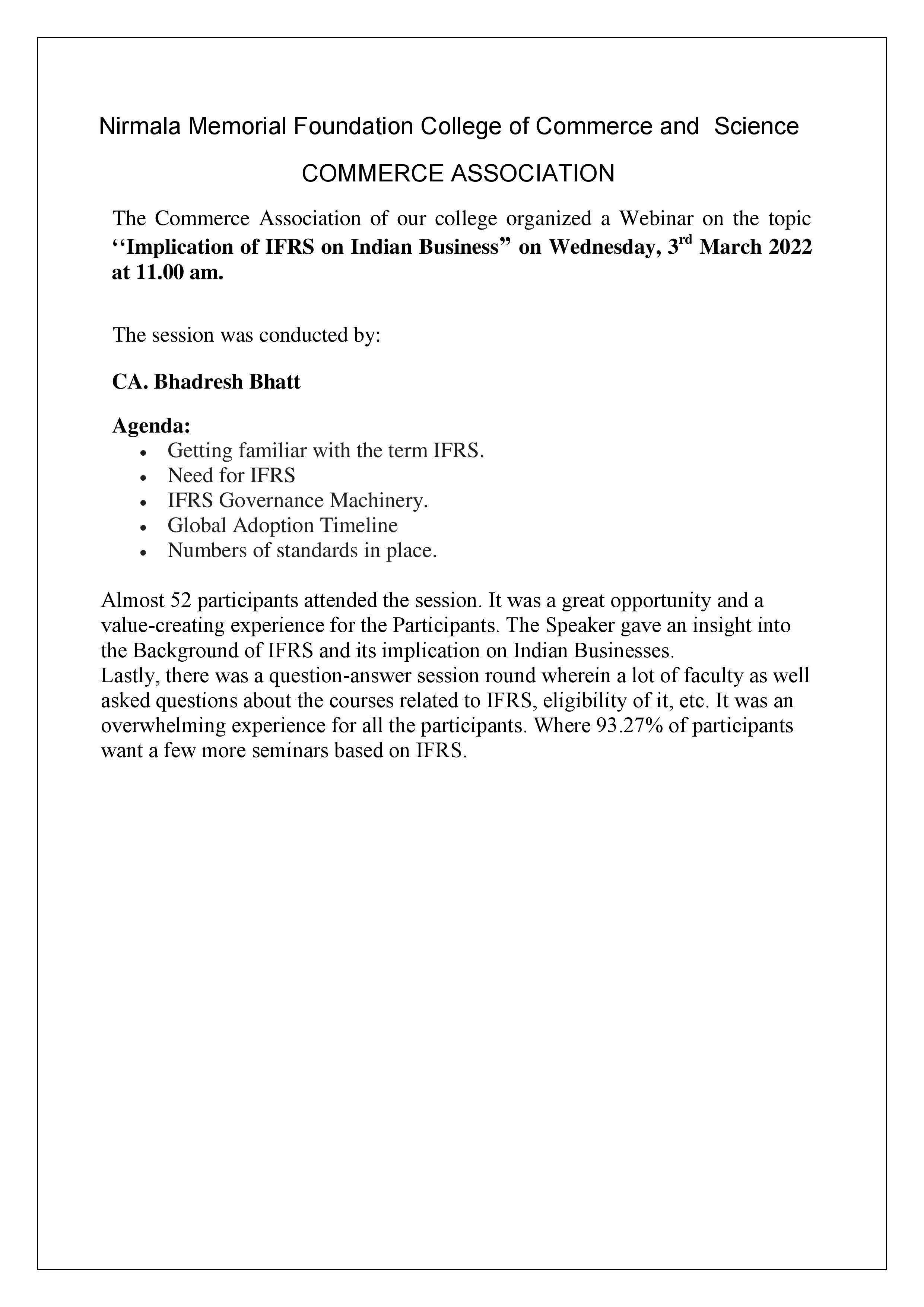 The Commerce Association of our college organized a Webinar on the topic ‘‘Implication of IFRS on Indian Business” on Wednesday, 3 rd March 2022 at 11.00 am.
