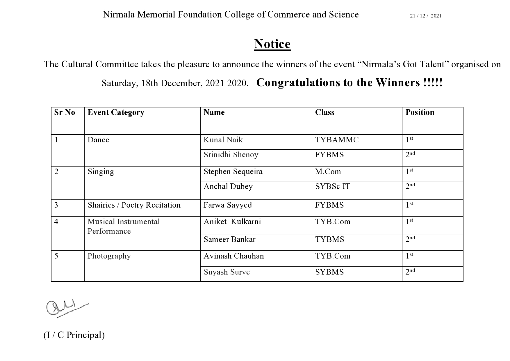 On Saturday, 18th December, the Cultural Committee of the College had organised Nirmala's Got Talent -2021 and gave a platform to students to showcase their talents in the category of Dance, Singing,, Photography and Musical Instruments. The Winners for Each Category were felicitated on this day. Boys of Band gave a Live Performance and added glory to the show.