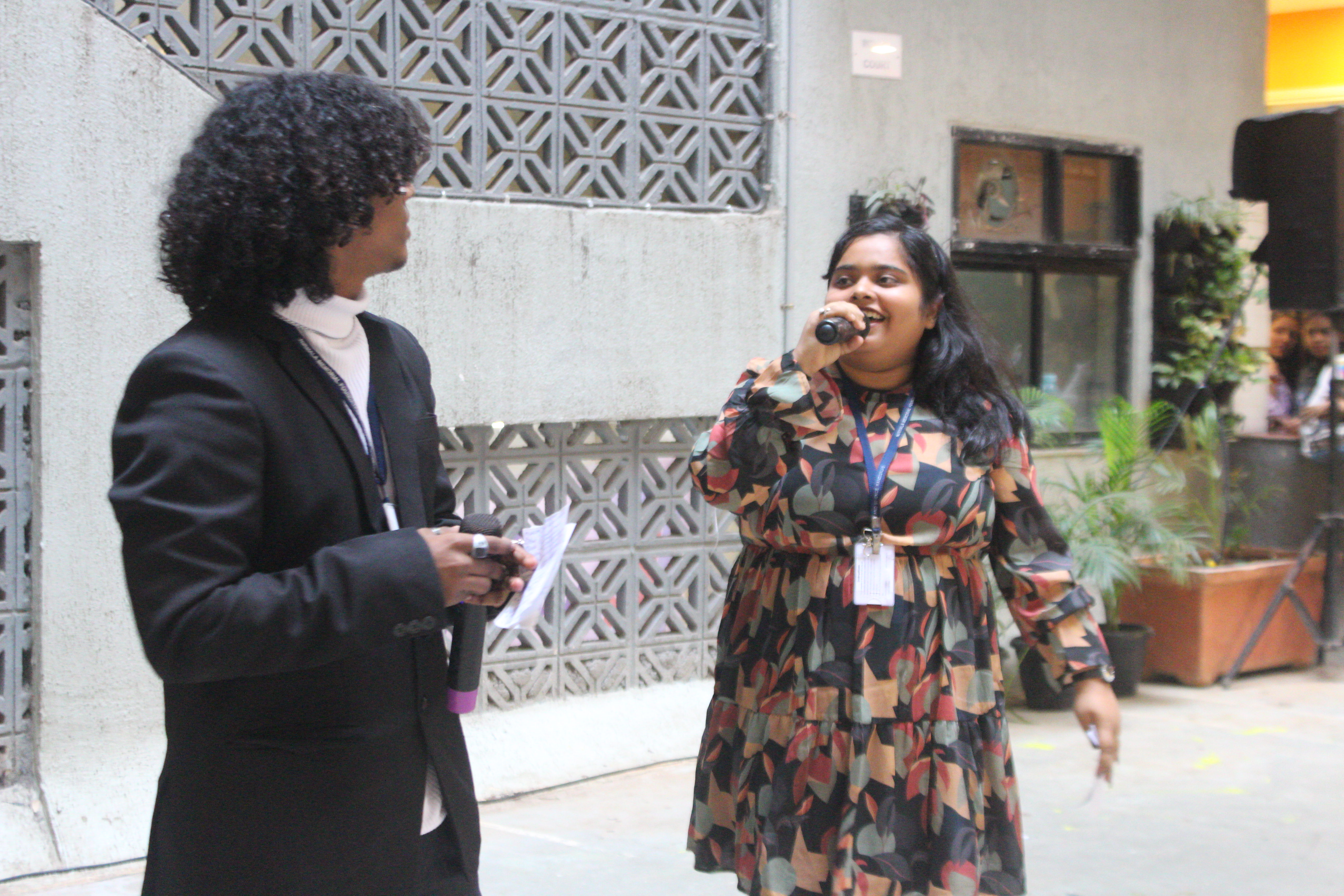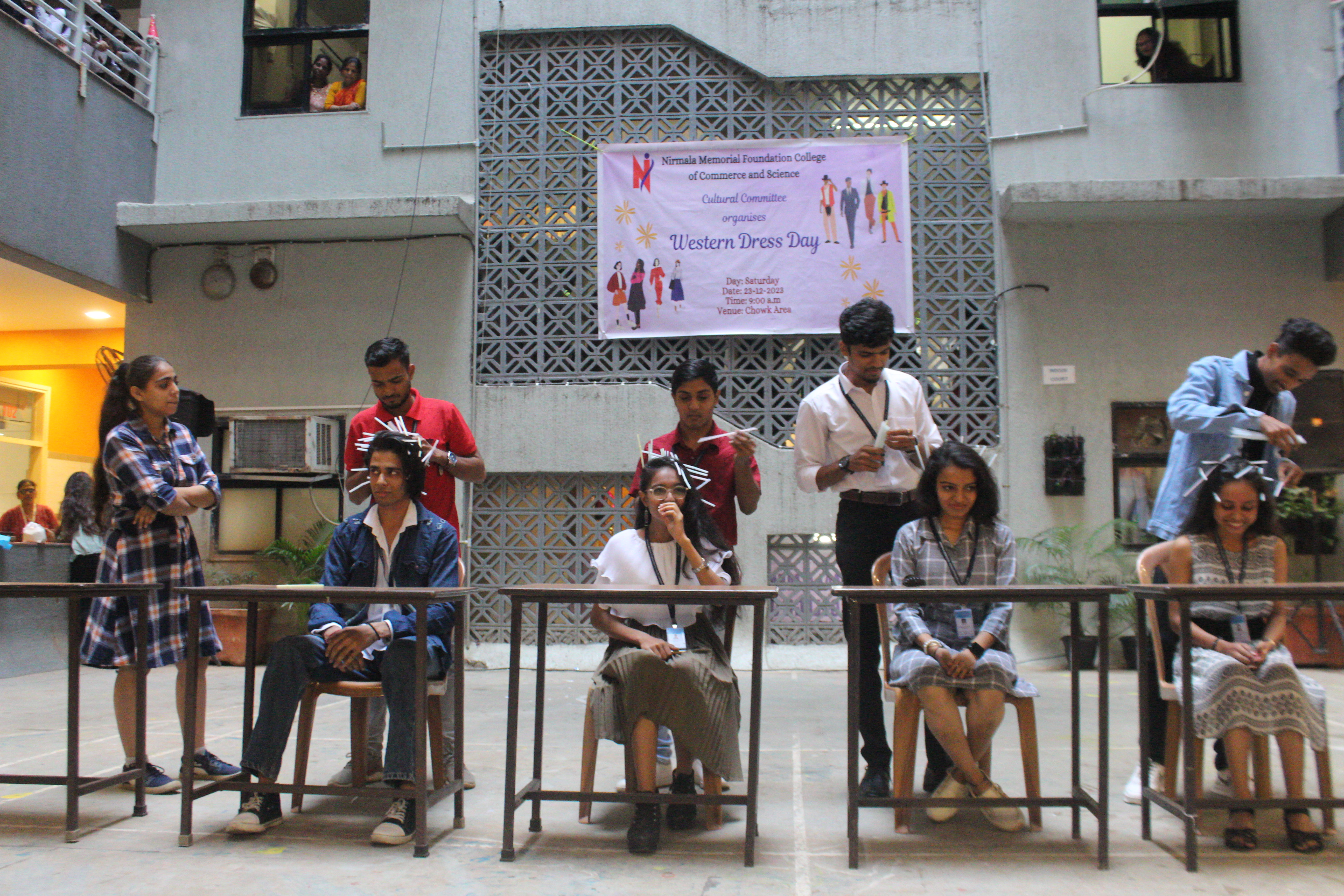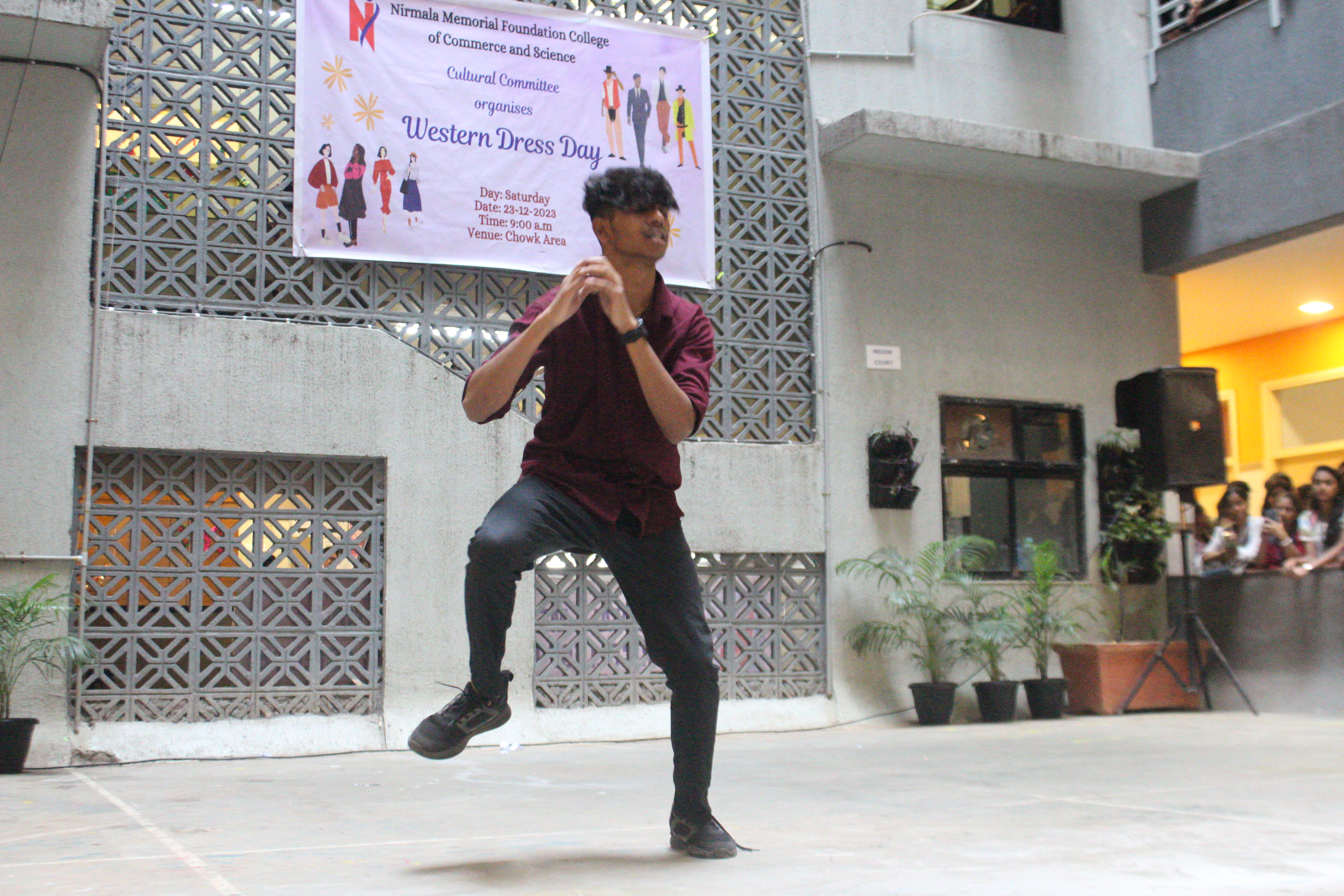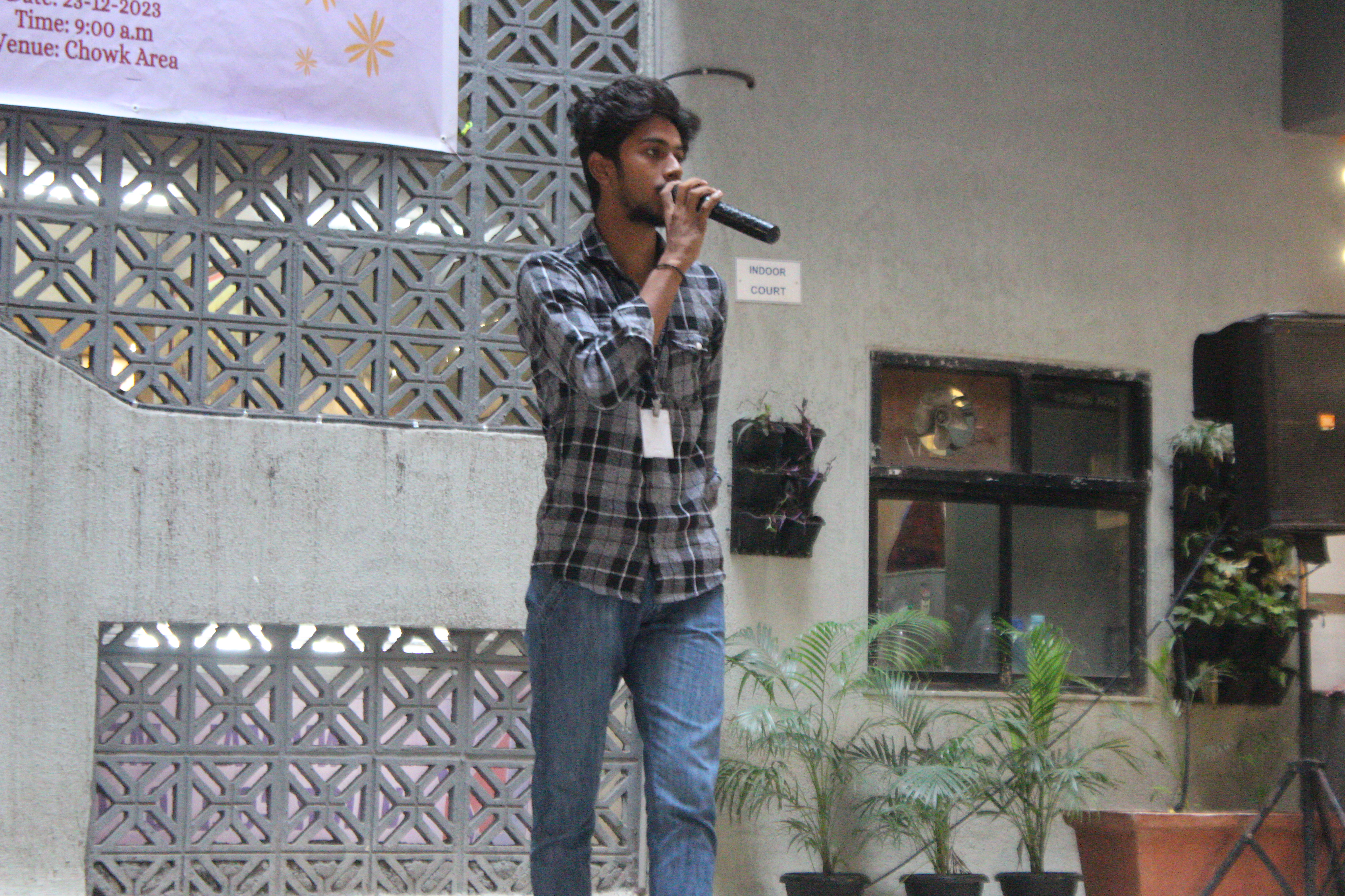 The Cultural Committee had organised an event titled “Western Dress Day” on Saturday, 23 rd December, 2023 at 9:00 a.m. It was a vibrant and lively event that showcased an amalgamation of diverse western fashion styles, fostering a spirit of creativity among the students. Held in the Chowk Area, the event drew enthusiastic participation from students from all the programmes. The celebration began with some fun and games followed by a dazzling dance performance by Mr. Pratham Mhatre. The crowd cheered as Mr. Suyash Rode then took over the stage and mesmerised the audience with his singing. Mr. Sahil Chavan accompanied him with his electric guitar. Students adorned themselves in a kaleidoscope of western attire, presenting a blend of elegant suits, vibrant dresses and denim ensembles. The campus radiated with enthusiasm as students flaunted their unique interpretations of western fashion. The event concluded with the distribution of prizes to the winners of the games and with best wishes for the upcoming Christmas holidays.
