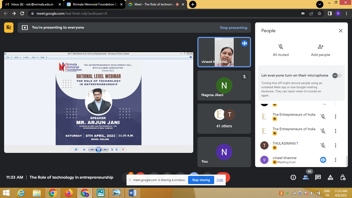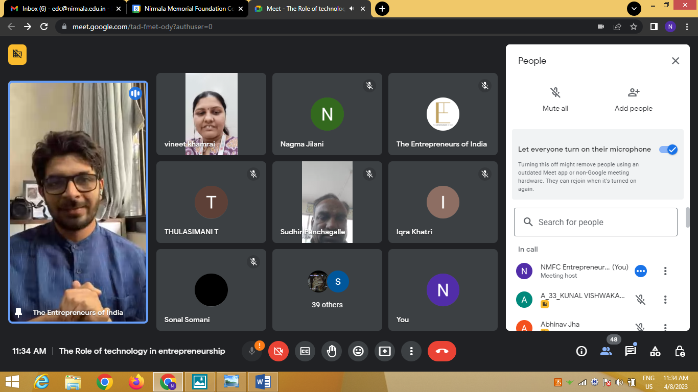 The Entrepreneurship Development Cell with Alumni Association of the college successfully conducted a National Level Webinar on the topic of "The Role of Technology in Entrepreneurship" on Saturday, 8th April 2023, at 11.30 a.m. The event featured Mr. Arjun Jani, an alumnus of NMFC and the Founder of The Entrepreneurs of India Company, as the guest speaker. The session covered a wide range of topics related to the importance of technology in entrepreneurship, including the role of technology in business model innovation, marketing, and customer acquisition. Mr. Jani shared his valuable insights and experiences on how technology has revolutionized the business world, and how entrepreneurs can leverage technology to scale their businesses. The interactive session allowed participants to ask questions and receive expert answers from Mr. Jani. The webinar was attended by more than 55 students and teachers who are interested in the world of business. The session was highly informative and insightful, providing participants with a deeper understanding of the role of technology in entrepreneurship.