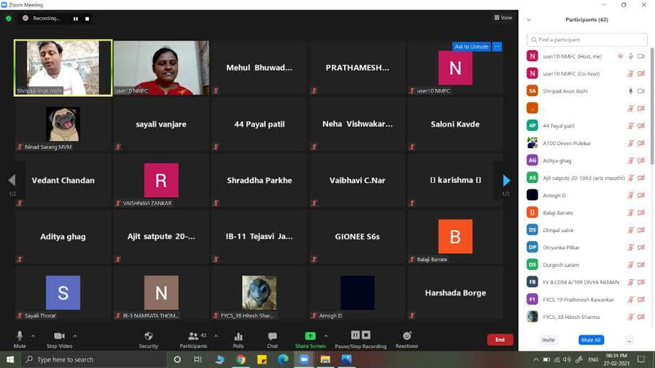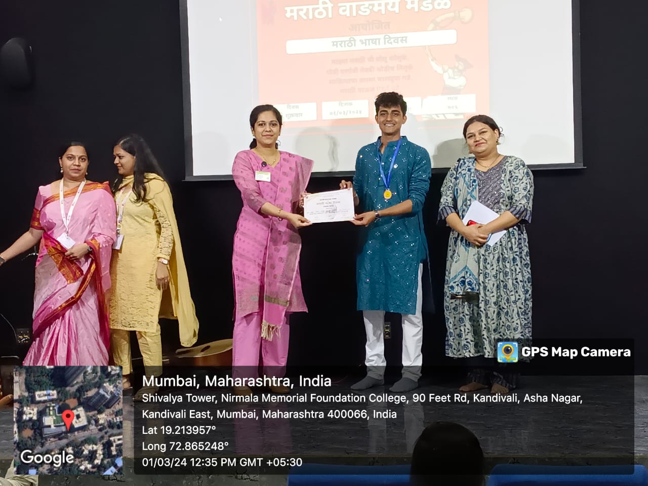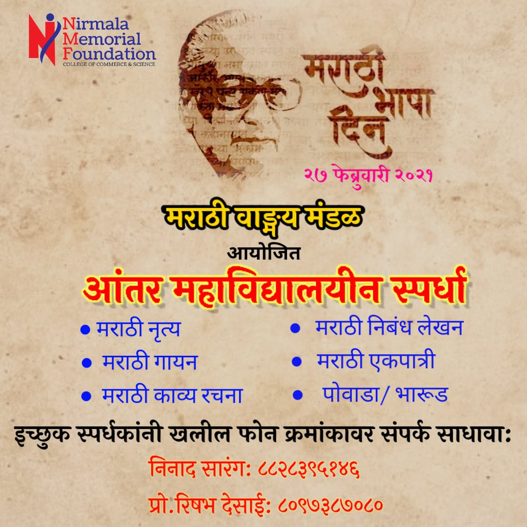 On 27th February 2021 Marathi Vangmay Mandal celebrated Marathi Bhasha Diwas by organizing various intercollegiate activities at state level. Activities included Singing, dancing, poetry recitation, monoacting etc. Around 15 colleges participated and best 3 from every activity were awarded. Mr. Shripad Joshi, Marathi Poet was invited as a Chief Guest to address the participants and tell them the beauty of Marathi language.