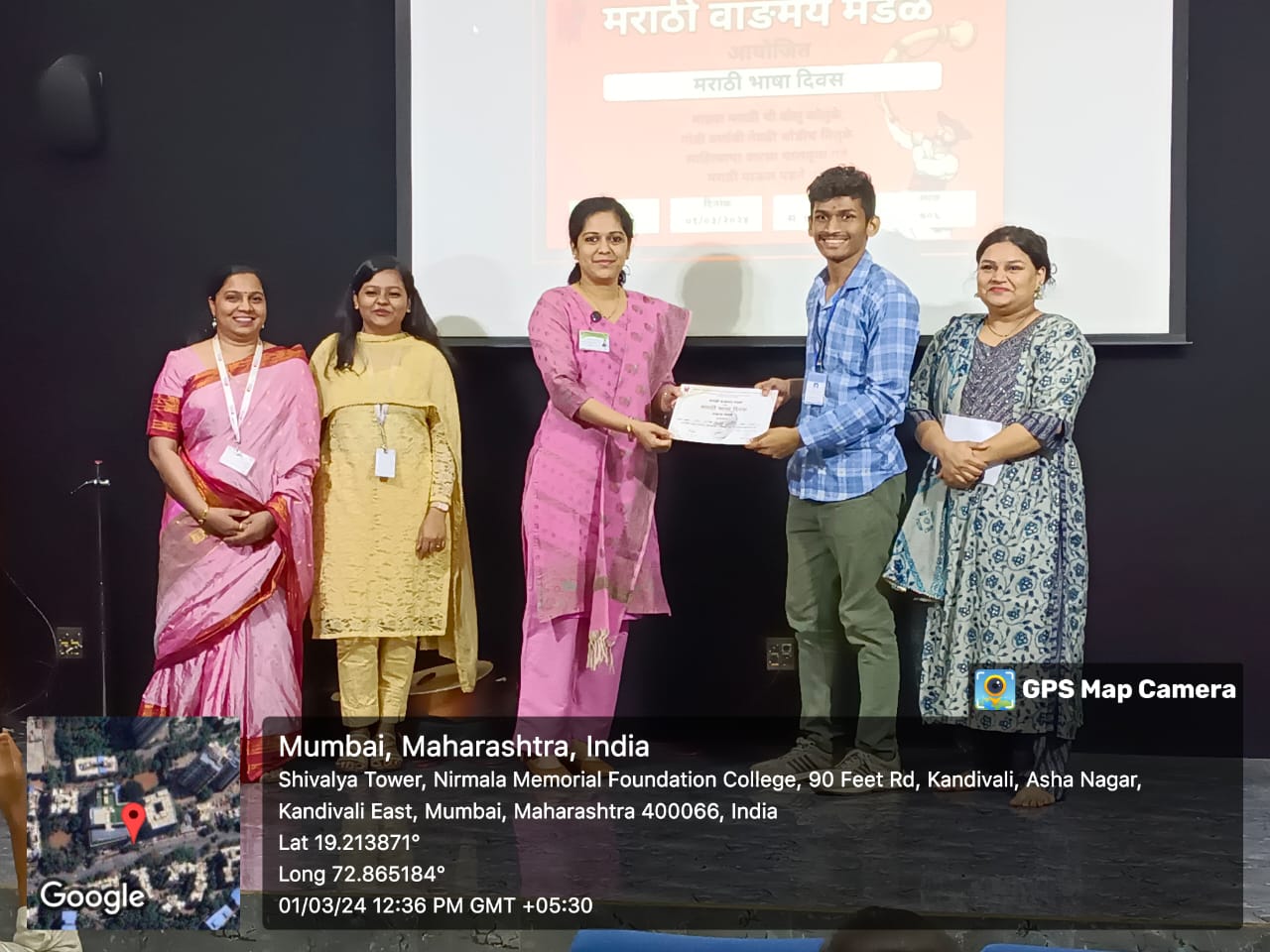 An event is organized “Marathi Bhasha Gaurav Din” as to celebrate by paying tributing on birthday of Vishnu Vaman Shirwadkar (Kusumagraj), Monday, 27th February, 2023 at 09:45 am. The event conducted in Mini Auditorium - participants presented marathi literature.