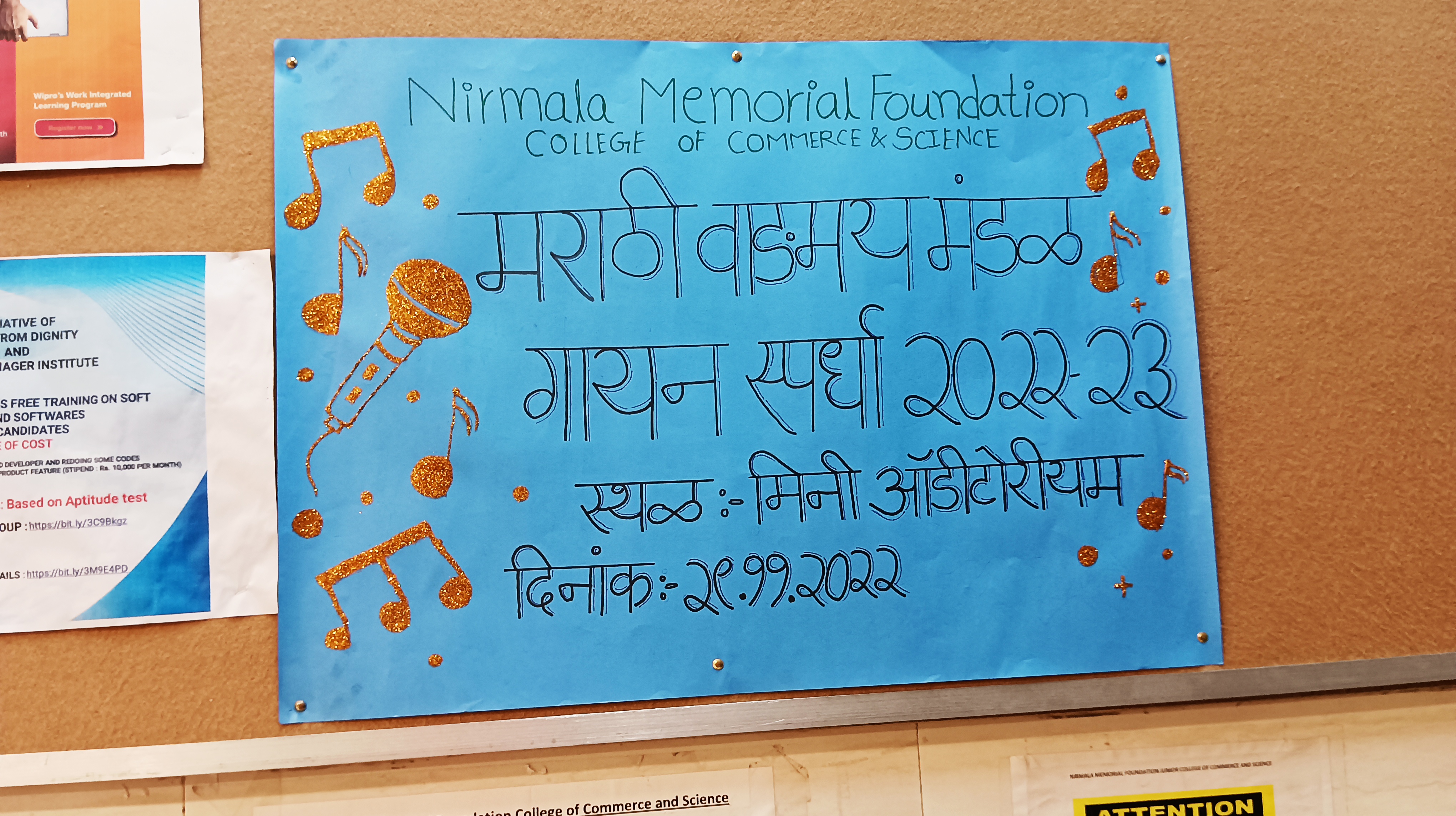 The Marathi Vangmaya Mandal of the college organized a Singing Competition in the Mini-Auditorium. An event is organized for enhancing the Maharashtrian tradition, Tuesday, 29th November, 2022 at 11:30 am. The event will be conducted in Mini-Auditorium. Almost 8 participants participated in the event. It was a very enthusiastic event for all. The Judge gave a remarkable view on the event organized by the Marathi Vangmaya Mandal. It was an overwhelming experience for all the participants.