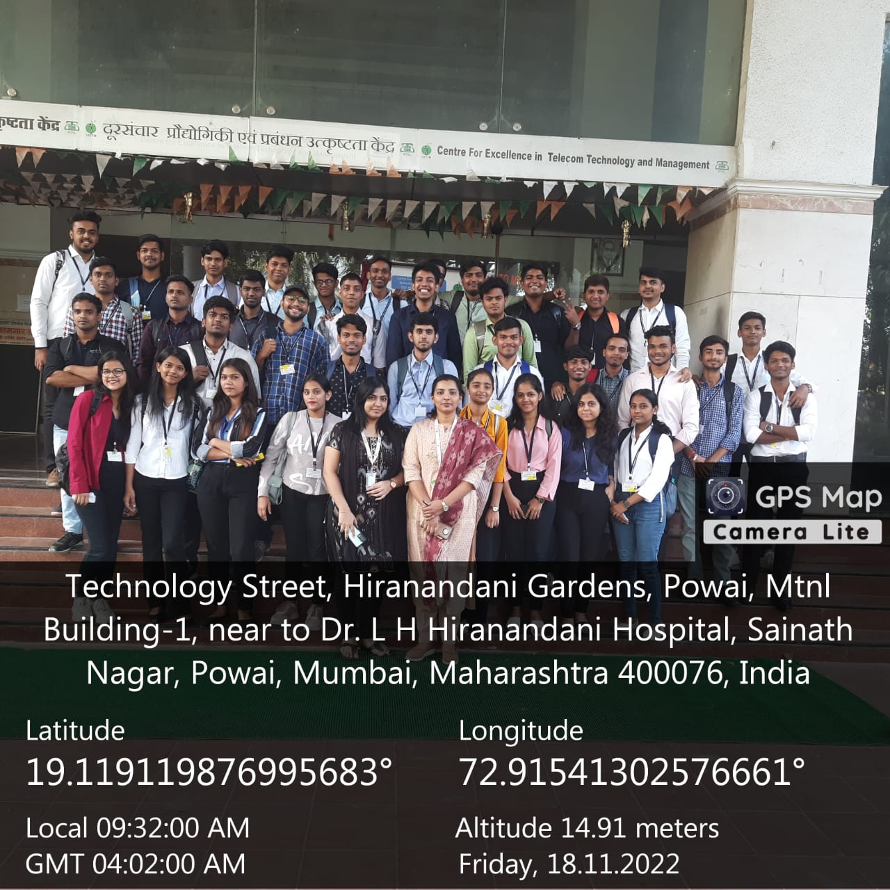 Industrial visit was carried out at MTNL (Mahanagar Telephone Nigam Ltd.) CETTM, Powai, Mumbai on Saturday , 20th August, 2022. The goal of the industrial visit was to achieve better understanding and practical exposure of Mobile Communications Systems. Mahanagar Telephone Nigam Limited (MTNL) is a state-owned telecommunications service provider in the metro cities of Mumbai. MTNL provides fixed line telephones, cellular connection, internetservices through dialup and Broadband internet-TriBand.Total of 37 students were part of this industrial visit. Everyone gathered at the entrance gate of the college including faculty members Prof.Hiral Parakhiya and Prof. Tanvi More. We left the college premises at 8:30 a.m. We were further assisted by MTNL Staff at MTNL.All the students were seated in the presentation room, where the Senior Manager had an introductory talk with all the students about working for MTNL.Then we were taught about the GSM(Global System for Mobile communication), types of antennas and their applications. After this all the students were taken to a lab for showcasing an In building solution for network connectivity .Second lecture was taken in a round table conference room where we were taught about Optical fiber cable, broadband connectivity and switching. After the lecture everyone was taken to the switching unit and broadband unit where actual working of these units were shown.We took almost 6 hours to see various units at MTNL CETTM which was followed by questions/feedback from students. We appreciate staff members who guided students with each and every question with detailed answers.We would like to extend our gratitude to the company for the permission and support they gave to make our visit a success with accomplishment of objective and our Faculty members for arranging this visit for students.