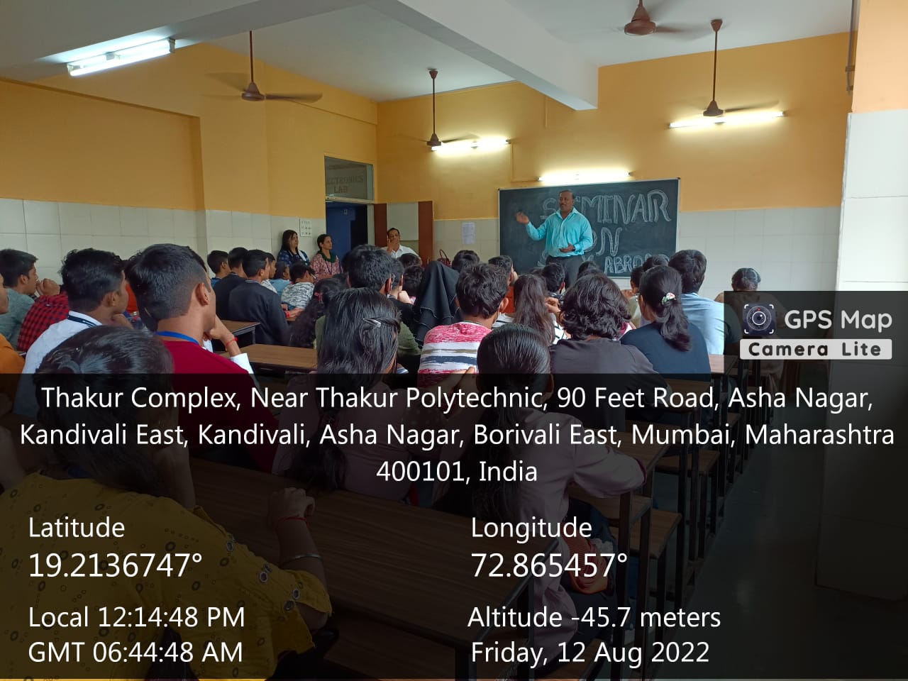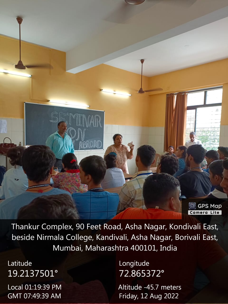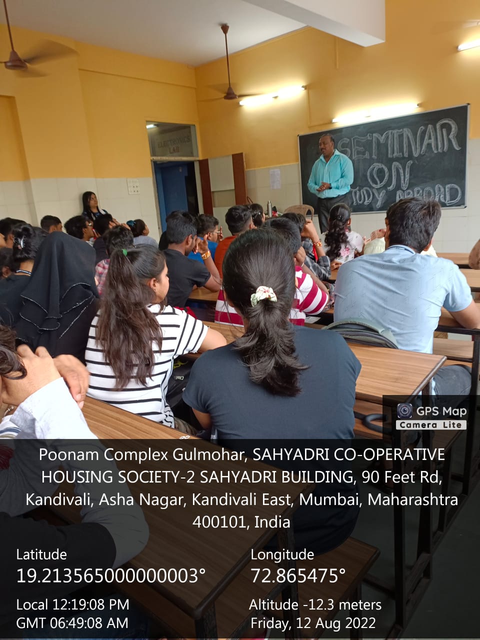 The Department of B.Sc.IT and B.Sc. CS had organised a seminar on “Career Counselling to study Abroad” for the First Year Students of B.Sc. IT and B.Sc. CS. The introductory part of the session was conducted by Mr. Nitesh Jogade, Deputy Manager T.I.M.E. This seminar was organised to let the students know about the pursuing higher study from Abroad and the process and procedure to apply for the same well in advance.The speaker also threw light on how to apply after graduation, expense of the courses, job package and demand of the courses in current industry etc. That was a quite interactive, informative and motivational session with maximum involvement of students.