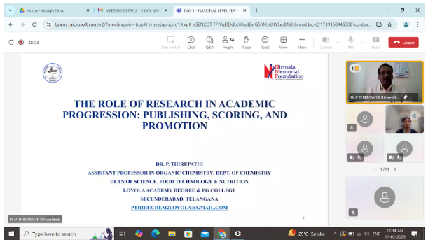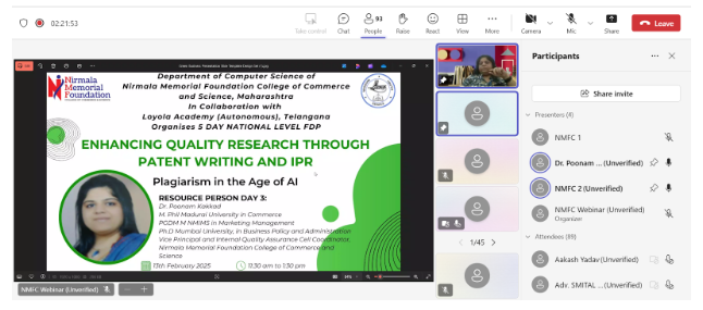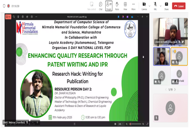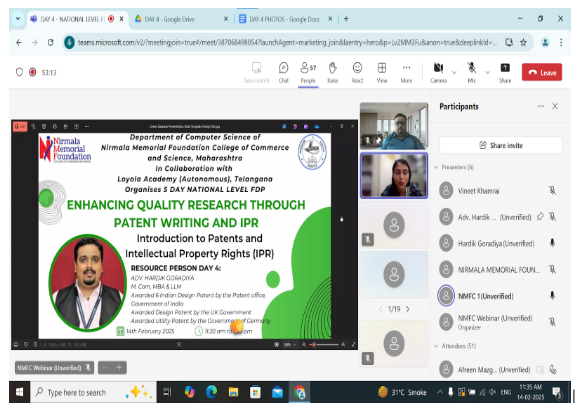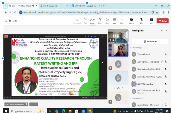 The 5 days National Level Faculty Development Programme (FDP) was held from 11th to 15th February 2025 on the topic "Enhancing Quality Research through Patent Writing and Intellectual Property Rights (IPR)", aimed at equipping faculty members with essential knowledge and skills in patenting and IPR. The program aimed to emphasize the importance of intellectual property in research and foster a culture of innovation within academic institutions. It was organized by Nirmala Memorial Foundation College of Commerce and Science, Maharashtra in collaboration with Loyola Academy(Autonomous), Telangana. It was conducted online on MS Teams at NMFC Kandivali (E), by the department of BSc CS.