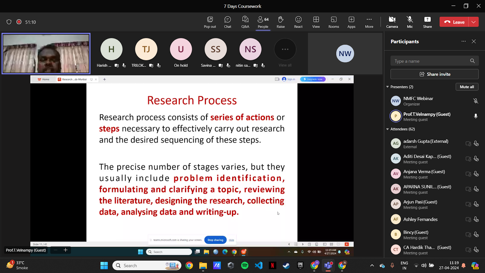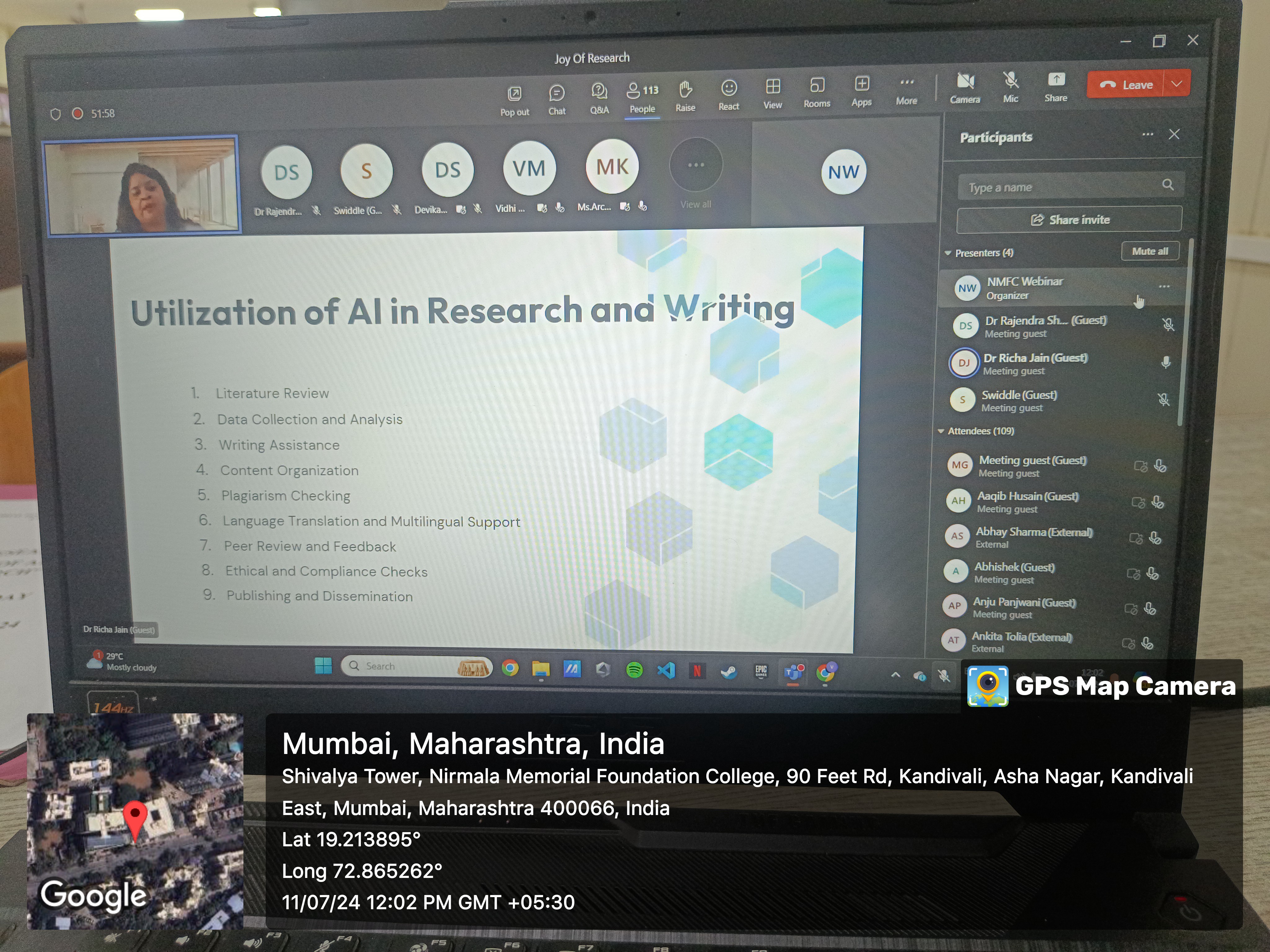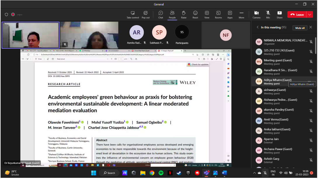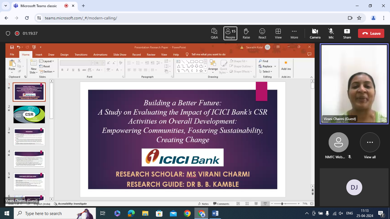 The Research Cell of Nirmala Memorial Foundation College of Commerce and Science, in collaboration with the University of Mumbai, organized a 7-day online workshop titled "Advancing Research Excellence: Methodologies and Innovations" from April 21st to April 28th, 2025, via MS Teams. The workshop aimed to enhance research skills through expert-led sessions on topics such as structuring research objectives, questionnaire framing, literature review methods, quantitative analysis, hypothesis testing, and reference management using Zotero. Renowned academicians and professionals conducted the sessions, providing participants with valuable insights into advanced research practices. The workshop witnessed enthusiastic participation from around 70 attendees, including teachers, research scholars, and students, representing various states across India such as Tamil Nadu, West Bengal, Delhi, and others. The diverse participation highlighted the national reach and impact of the program. Attendance on all days was mandatory, and an online test was conducted at the end of the workshop. Participants who successfully completed the requirements were awarded certificates of completion.