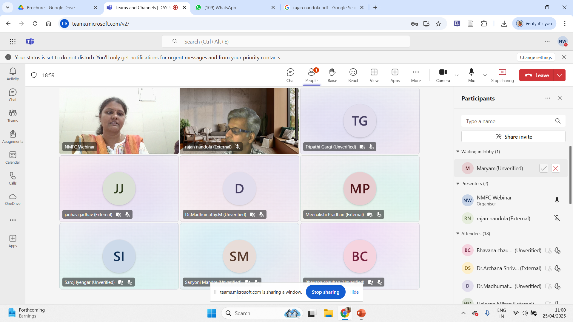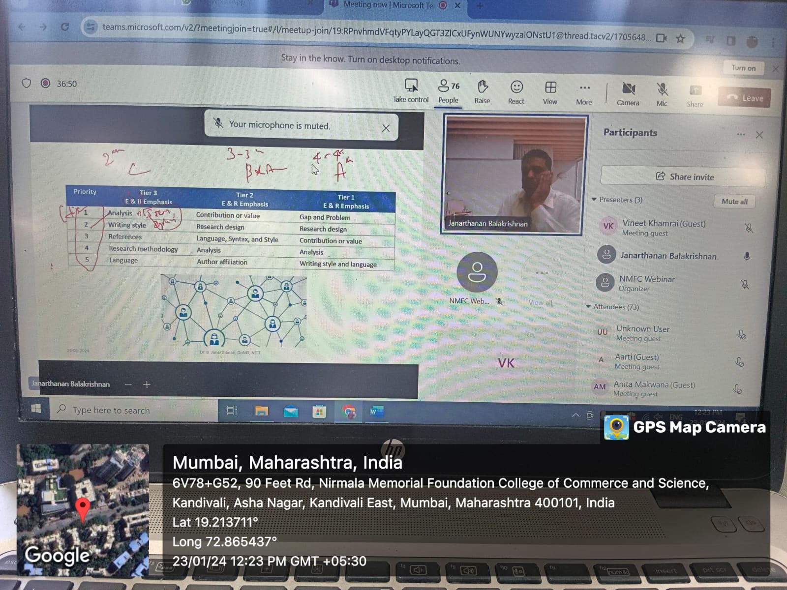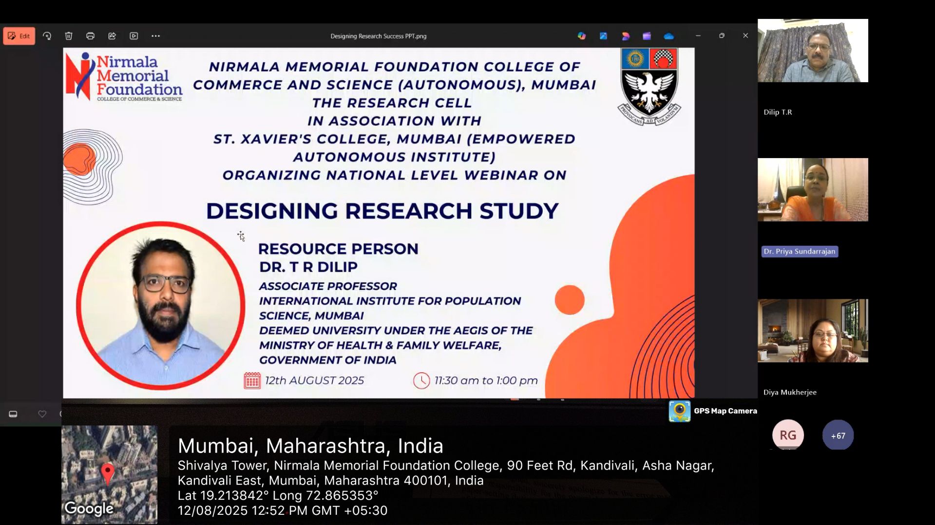 The Research Cell of Nirmala Memorial Foundation College of Commerce and Science, (Autonomous) in association with St. Xavier’s College (Empowered Autonomous Institute), organized a National Level Webinar on “Designing a Research Study” on Tuesday, 12th August, 2025 by Dr. Dilip T. R., Associate Professor, International Institute for Population Sciences, Mumbai, under the Ministry of Health & Family Welfare, Government of India.The webinar saw 229 registrations and 130 participants and was highly appreciated for its qualitative content, detailed explanations, introduction of new concepts, and linkages with government schemes. The session was impactful, enhancing participants’ understanding of research methodologies. The organising committee thanked the management, principals, and vice principals of both institutions for their support and collaboration.