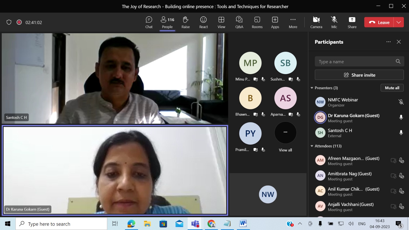Research Cell of the college in association with St. Xavier’s College (Autonomous), Mumbai organised a National Level Workshop on The Joy of Research titled “Building Online Presence: Tools and Techniques For Researchers'' on Monday, 4th September, 2023, from 2.30 pm to 4.30 pm. Resource person for the event was Dr. Santosh C. Hulagabali, Librarian, Central University of Haryana, Haryana. The total number of participants was 203, belonging to various states like Gujarat, Karnataka, Tamil Nadu, UP, Bihar, Madhya Pradesh, Odisha, etc. Participants learned about academic writing tools like Plumx, Almetric, Google Scholar, Research Gate, Zotero, Citeulike, Twitter, Facebook, Mendeley, LinkedIn, etc.