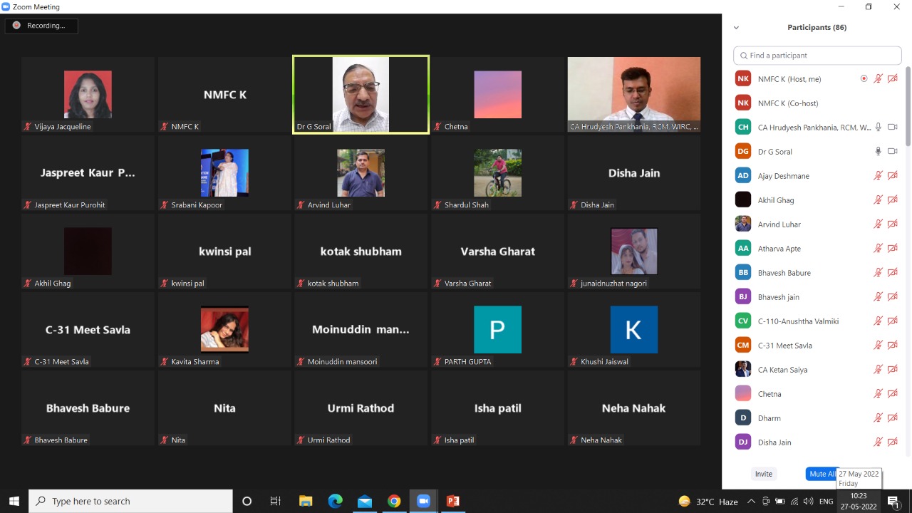 Research cell and IQAC organized a one day Conference on “EMERGING TRENDS IN THE FIELD OF COMMERCE, MANAGEMENT, SCIENCE & IT” in collaboration with ICAI - Institute of Chartered Accountants of India. on Friday 27th May 2022. The conference was inaugurated by Dr. G. Soral, Past President , IIA and Professor (Dr) Arvind Lohar