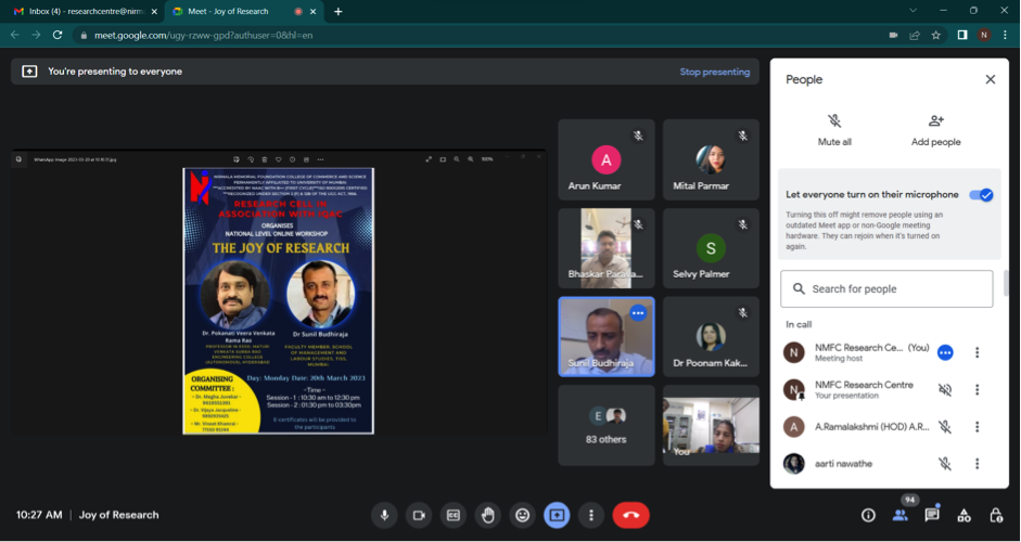 IQAC in co-ordination with Research Cell organised The Joy of Research. The workshop was organised on Monday, 21st March 2023 wherein, 2 sessions were conducted. The workshop received huge participation of researchers from all over the country. Around 200 participants attended the workshop and appreciated the knowledge shared by the speakers. The sessions conducted were:
