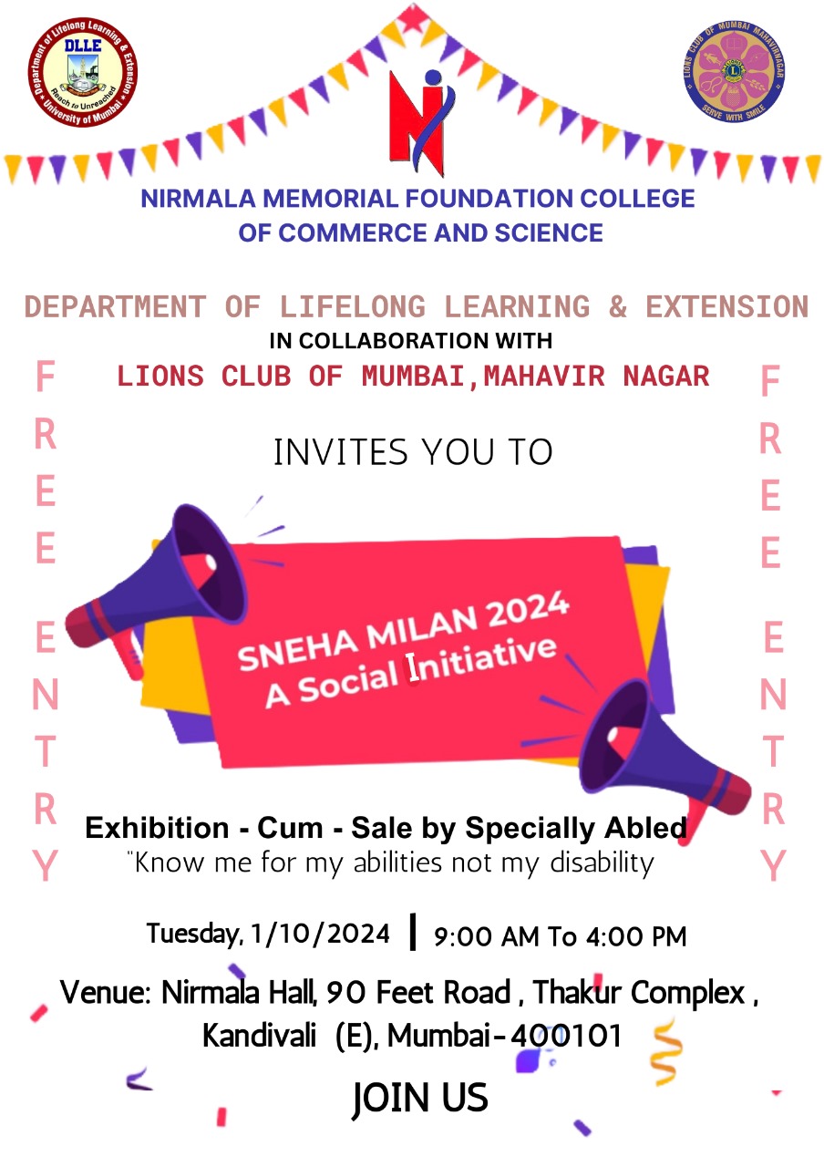 The DLLE unit of Nirmala Memorial Foundation College has organised SNEHA MILAN ( An Exhibition cum Sale of products made by the Specially Abled People)